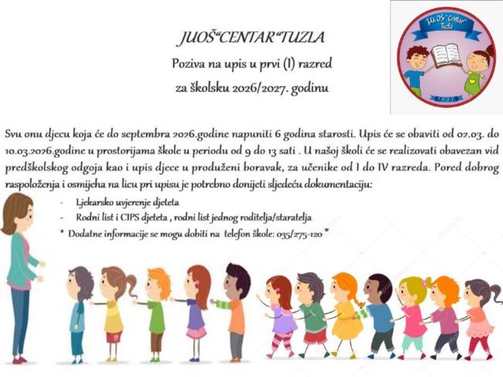 JUOŠ “Centar” poziva na upis u prvi razred djecu koja će do septembra 2026.godine napuniti