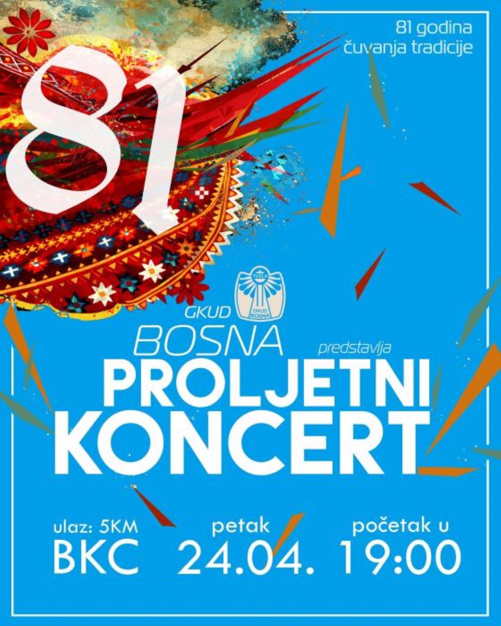 Gradsko kulturno-umjetničko društvo “Bosna” najavljuje svečani proljetni koncert pod sloganom „81 godina kulture i umjetnosti“, koji će biti održan danas, 24. aprila 2026. godine, u Bosanskom kulturnom centru Tuzla s početkom u 19:00 sati.